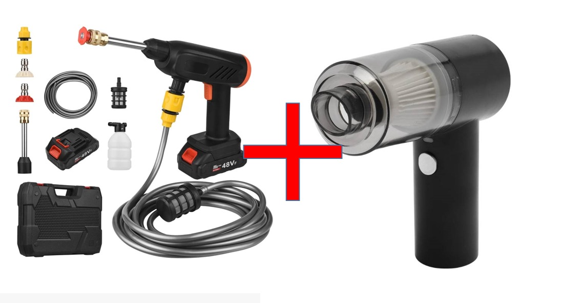 Combo versátil y portátil que incluye una hidrolavadora inalámbrica de 48 V con batería recargable y una aspiradora de mano portátil 2 en 1. La hidrolavadora ofrece una presión de hasta 464 PSI (≈32 bar) con caudal de 240 L/h, ideal para limpiar vehículos, jardines y superficies exteriores. La aspiradora es ligera, funcional para limpieza rápida en seco, sin bolsa y cuenta con batería recargable. Ambos componentes se presentan en un diseño compacto y práctico, con funda o maletín incluido para transporte y almacenamiento .